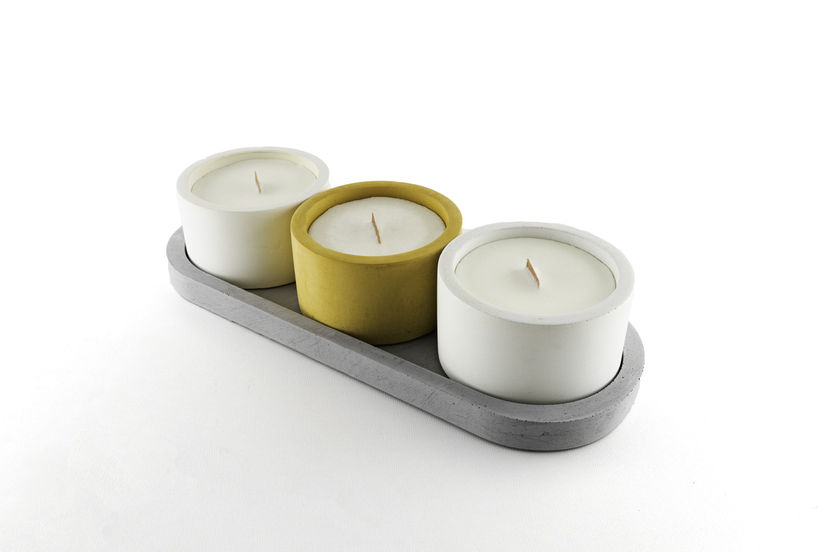 A minimalist concrete tray designed to hold three candles in a clean, linear arrangement. Its elongated form adds a sculptural touch to any setting, blending utility with modern elegance. Meticulously handcrafted from durable GRC and offered in a rich palette of colors.