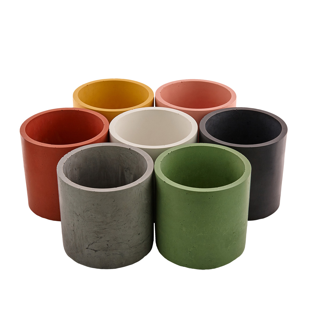 Ręcznie wykonane z wysokiej jakości betonu GRC i dostępne w różnych kolorach, które można dopasować do pojemnika lub dowolnie go ze sobą zestawiać.